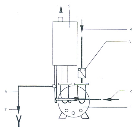 1. 2BV 真空(kong)泵 2. 供水管 3. 逆止閥(fa) 4. 吸氣管 5. 氣水分離(lí)器 6. 排氣管 7. 溢水管(guǎn)