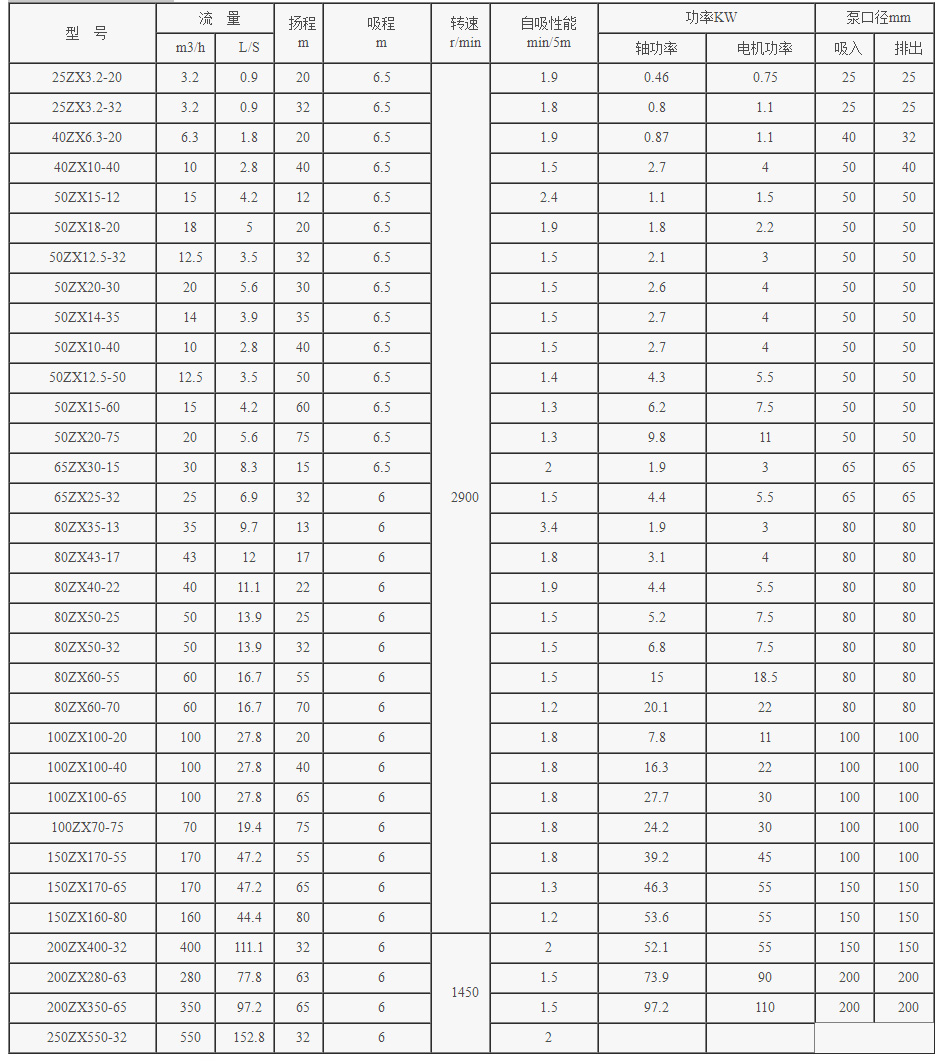 ZX系列自(zì)吸泵性(xìng)能參數(shu):