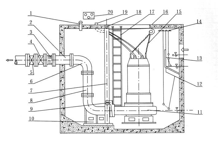 12.浮球開關(guān)(水位開關(guan))13.隔闆 14.浮球(qiu)固定架 15.小(xiao)鍊 16.挂鈎 17.人(ren)梯 18.支撐架(jià) 19.電纜出線(xian)管 20.電機保(bao)護器